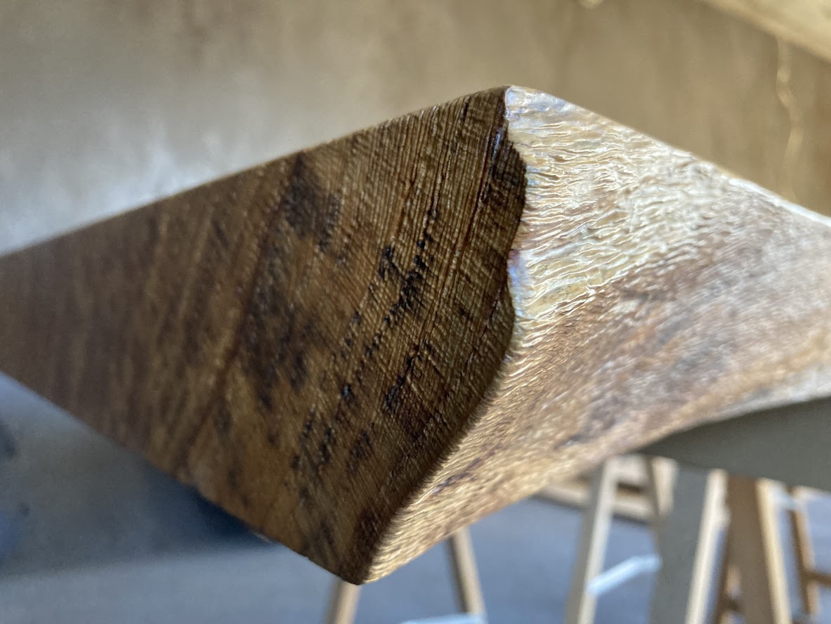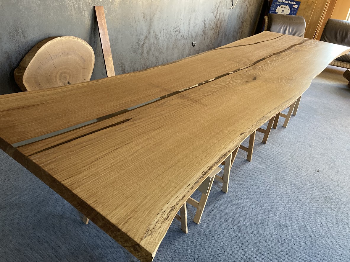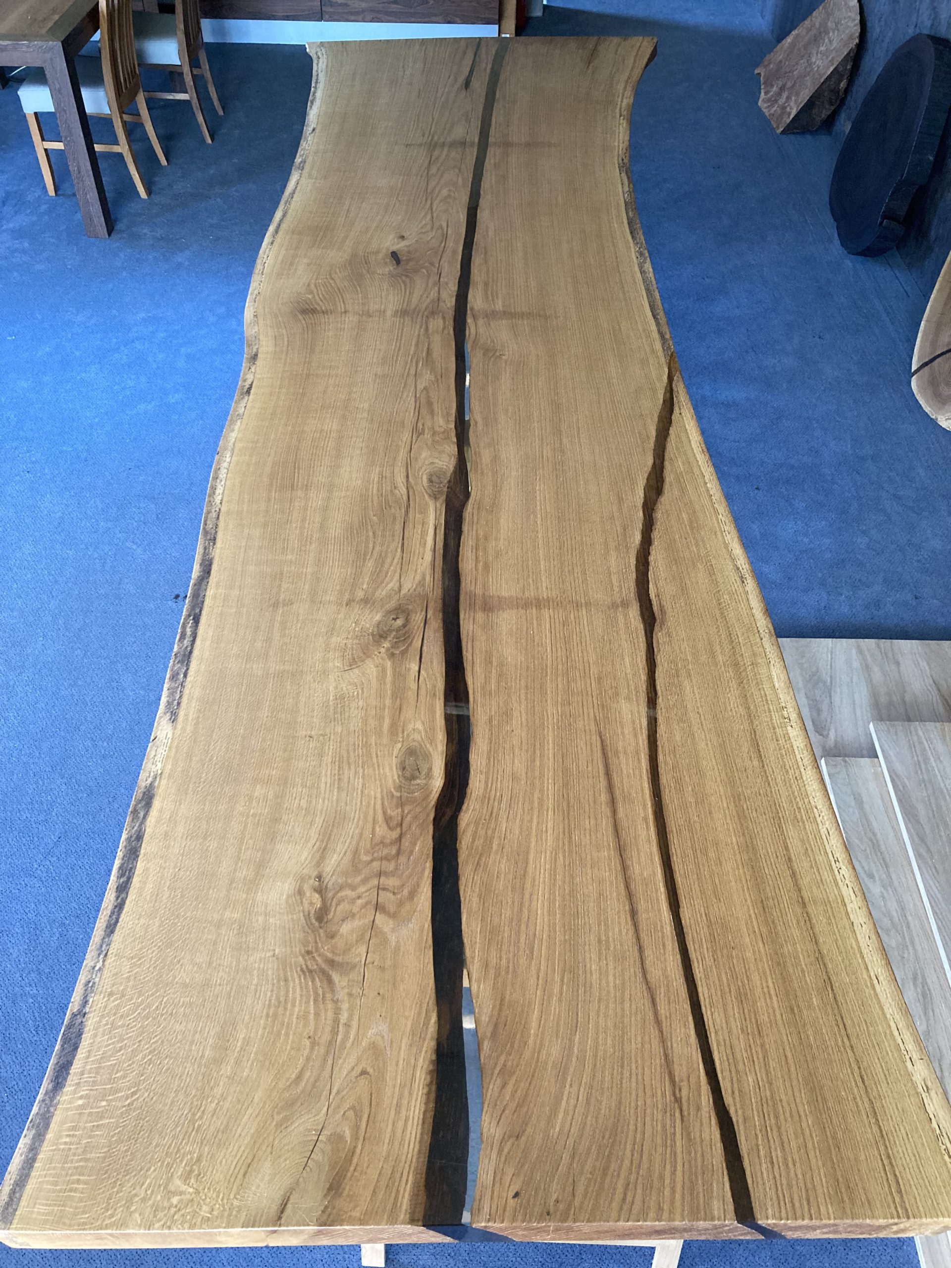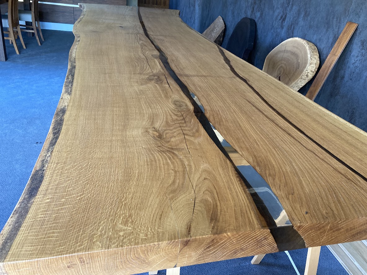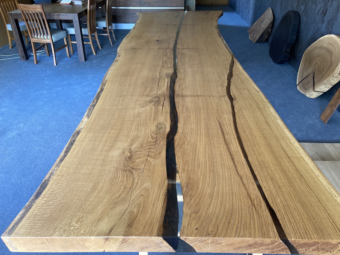 Blat – Dąb – wymiar 75×1000-1250x3900mm, lity, lakierowany (mat), ubytki (pęknięcia) zalane – żywicą
